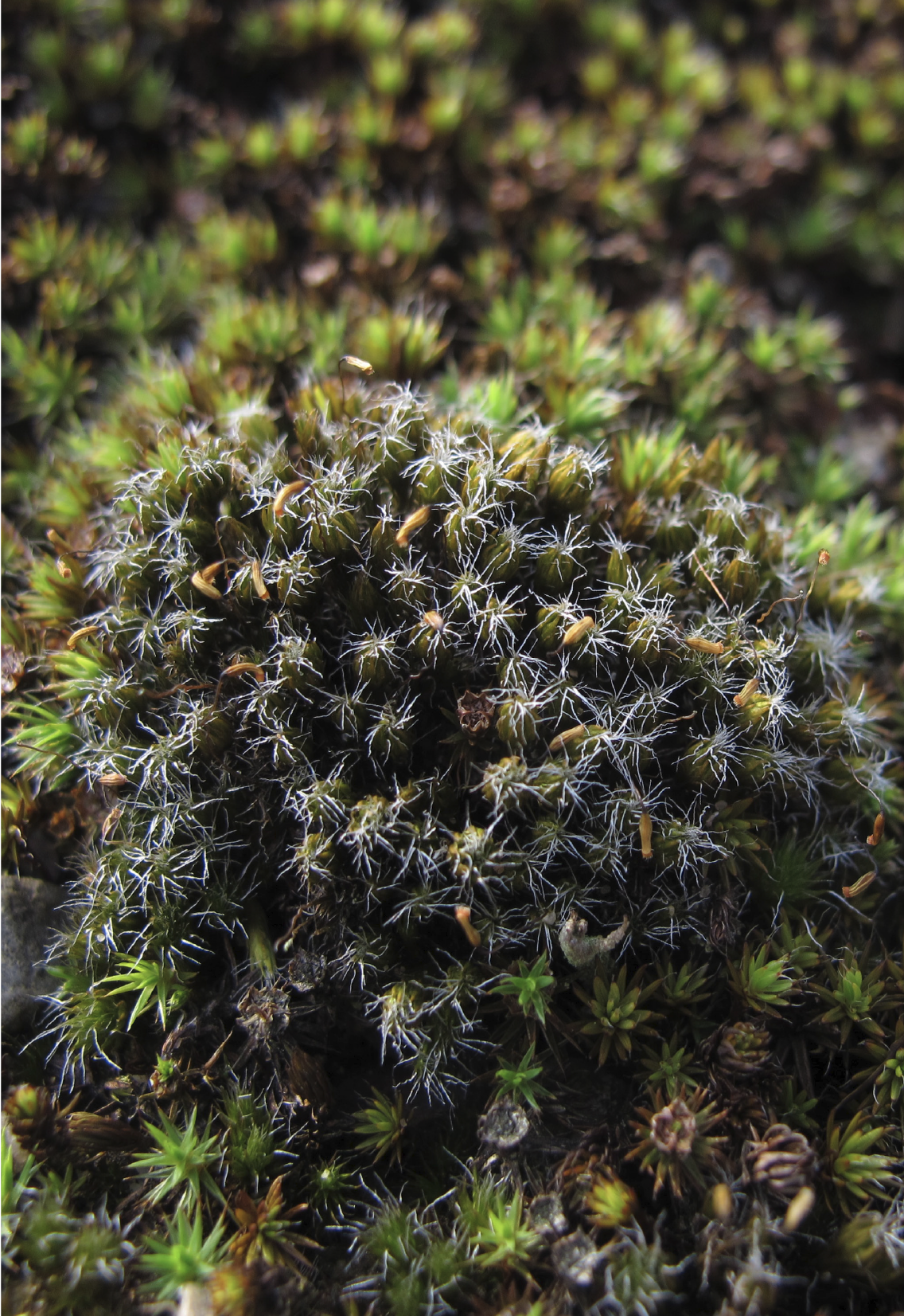 Ein auffallendes Moos der Küstendünen, das hier allerdings erst seit wenigen Jahr-zehnten vorkommt, ist das Kaktusmoos. Sei-nen Namen hat es von den bei Trockenheit waagerecht abstehenden haarfeinen Blatt-spitzen, die dann wie ein weißlicher Sta-chelpelz das hell- bis olivgrüne Moospol-ster überziehen.